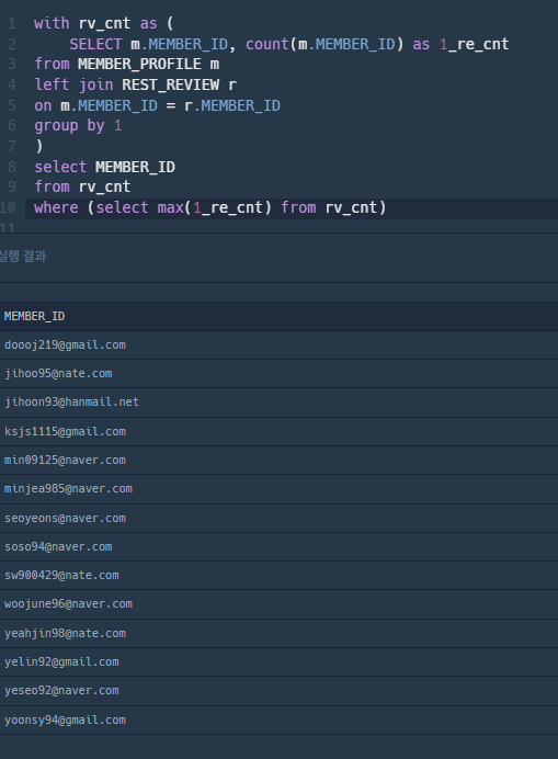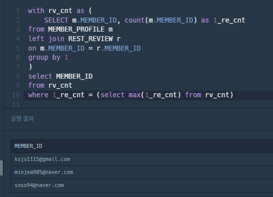 먼저 re_cnt 테이블을 만들어서 MEMBER_PROFILE 테이블과 REST_REVIEW테이블을 조인후